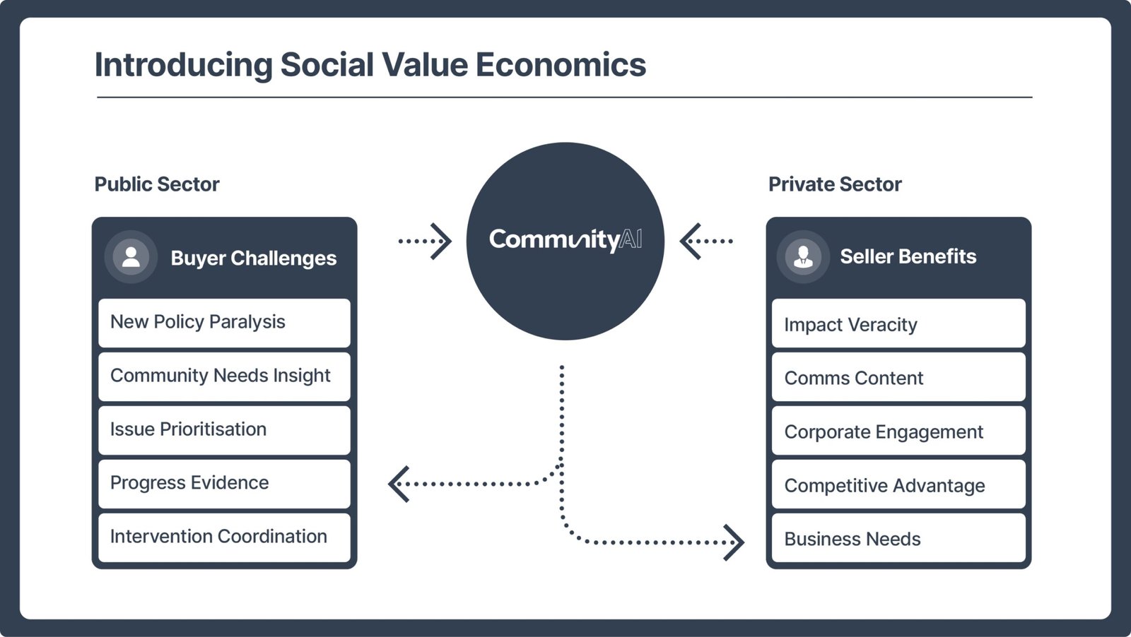 CommunityAI is strategically positioned between Buyers and Sellers, delivering measurable value to both. By deeply understanding the social and community challenges facing Buyers, we help Sellers direct funding toward targeted interventions that serve shared priorities and unlock mutual benefit. This approach enhances ROI through improved win rates, strengthened client engagement and reputation, all while improving the communities in which Sellers and Buyers operate.